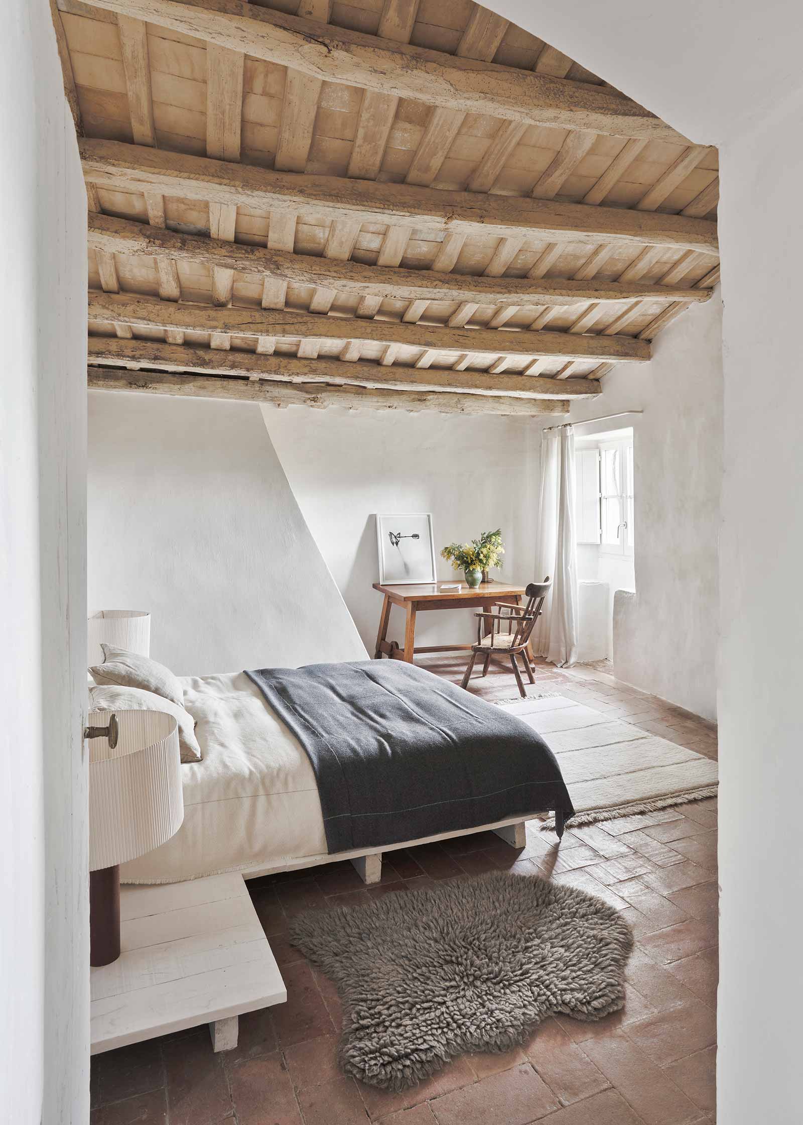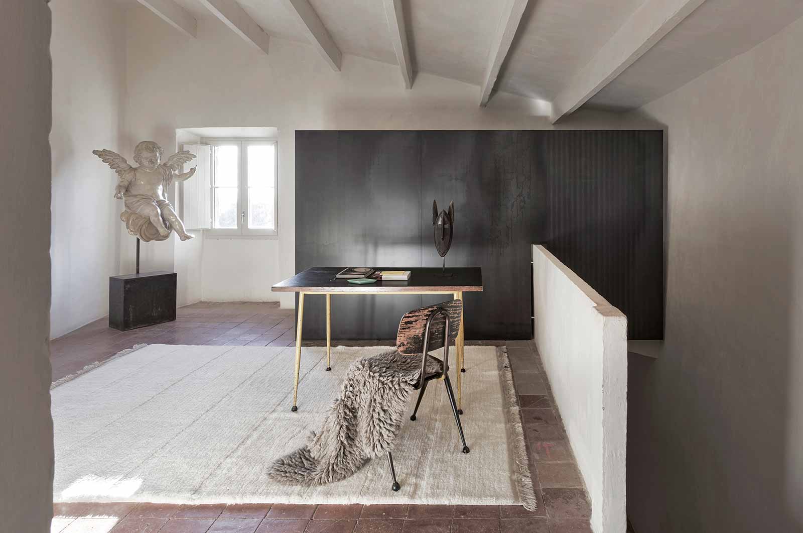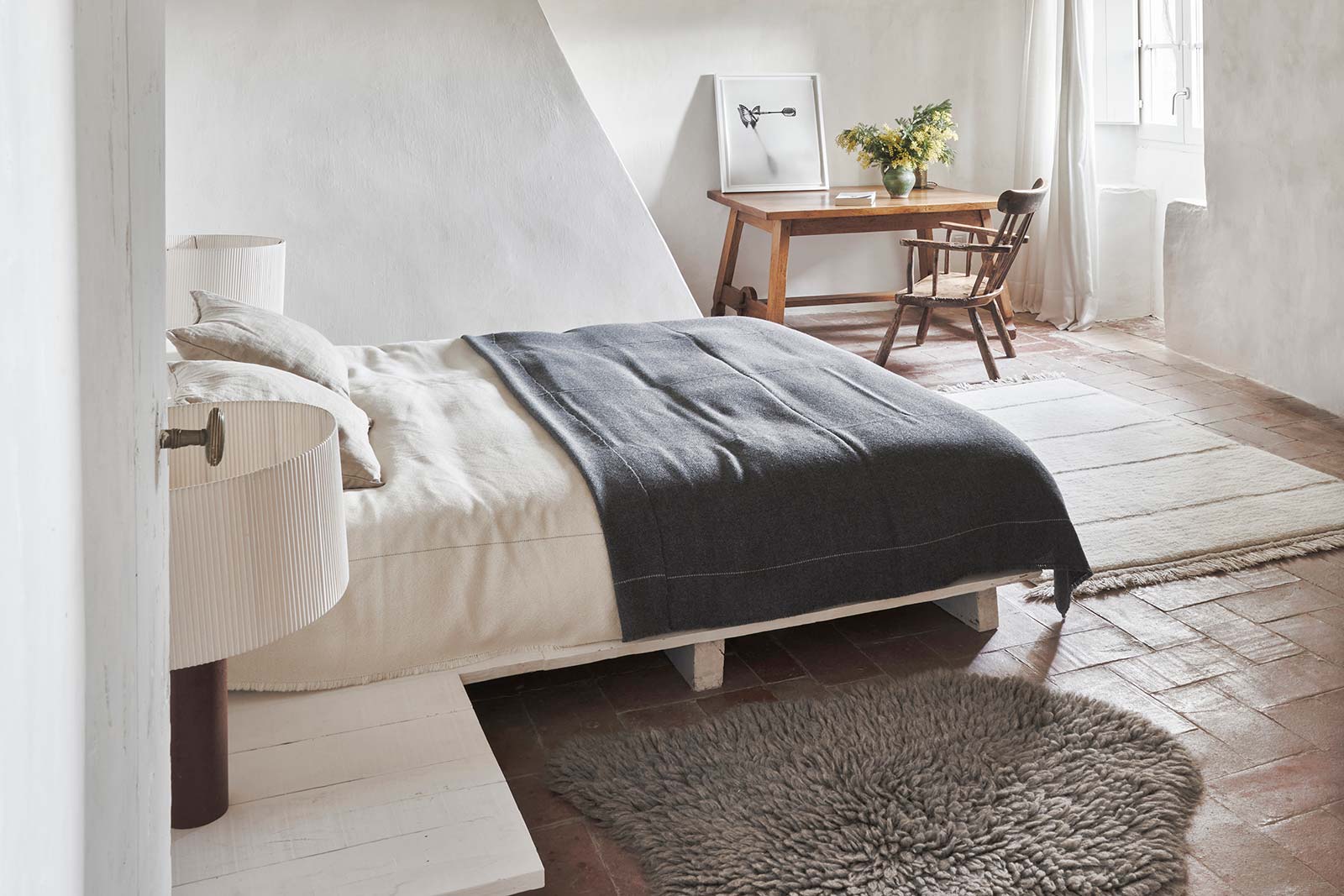 Il tappeto Woolly di Lorena Canals ha una forma arrotondata, che imita la silhouette di una pelle di pecora, ed è realizzato con un soffice vello di lana trapuntato su una base di cotone.